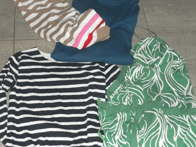 Eipä pitänyt käydä UFF:n tasarahapäivillä ja kävin kuitenkin. Nämä valitsin, hyvää kangasta ja neulosta oman näköisiin vaatteisiin. Ensin löysin neuleet, sitten raidallisen T-paidan, vihreävalkoinen kietaisumekko pisti silmään raikkaana tuulahduksena. On nyt tuuletettu kirpakassa pakkassäässä tuunausta varten. Millon muuttuvat, onkin kysymysmerkki. Juuri Nättirätille valitin, kun olen talviunilla - ei saa mitään aikaiseksi...
